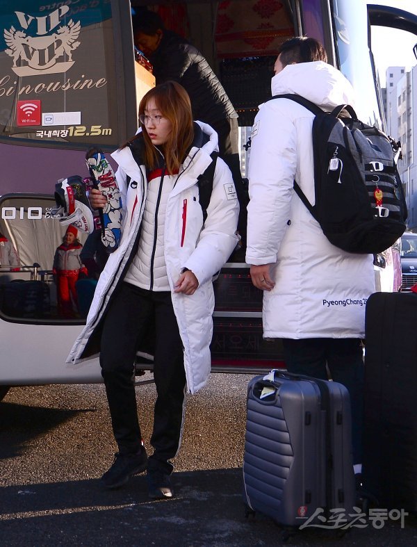 2018평창동계올림픽 쇼트트랙 대표팀이 5일 강원도 강릉선수촌에 입촌하고 있다. 최민정이 버스에서 내리고 있다.