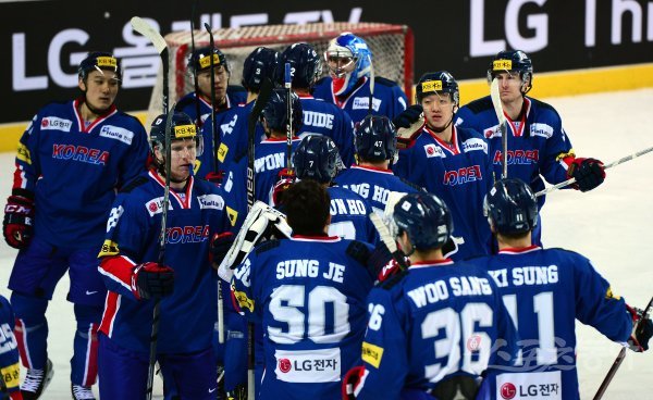 2018 평창동계올림픽을 앞두고 5일 인천 선학국제빙상장에서 한국과 카자흐스탄의 아이스하키 평가전 경기가 열렸다. 한국이 카자흐스탄에 3-0으로 승리한 뒤 선수들이 링크에서 기쁨을 나누고 있다.