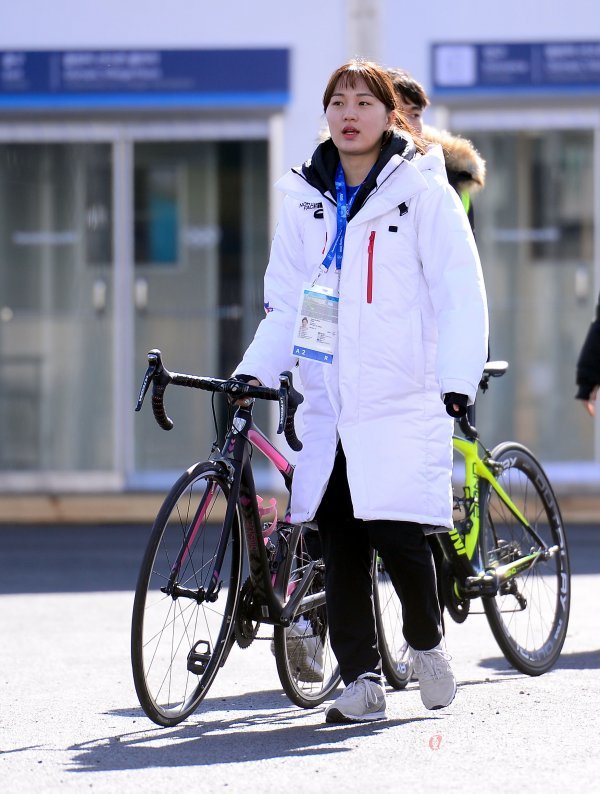 박승희가 자전거를 끌고 선수촌으로 향하고 있다.