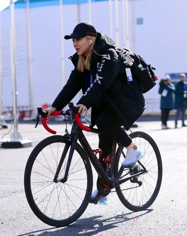 김보름이 자전거를 타고 선수촌으로 향하고 있다.