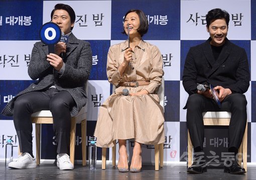 배우 김상경과 김희애, 김강우(왼쪽부터)가 6일 서울 압구정동 CGV압구정에서 열린 영화 ‘사라진 밤’ 제작보고회에서 OX퀴즈를 하며 웃고 있다.
