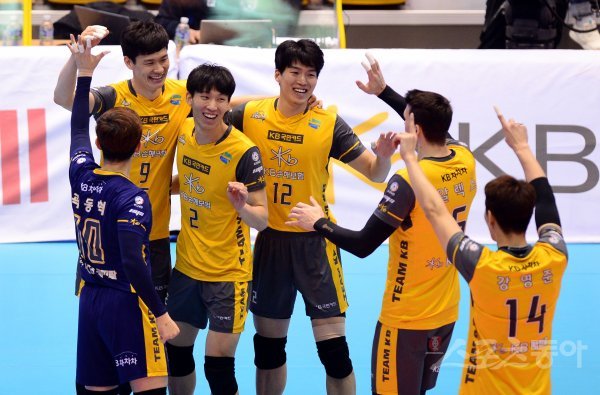 11일 경기도 의정부체육관에서 ‘2017-2018 도드람 V리그’ 의정부 KB손해보험과 대전 삼성화재의 경기가 열렸다. KB손해보험 이선규(9)가 V리그 남자부 최초 1,000블로킹을 성공한 뒤 동료들과 기쁨을 나누고 있다.