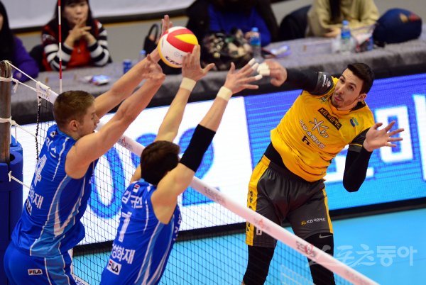 11일 경기도 의정부체육관에서 ‘2017-2018 도드람 V리그’ 의정부 KB손해보험과 대전 삼성화재의 경기가 열렸다. KB손해보험 알렉스가 삼성화재 블로커를 피해 스파이크를 날리고 있다.