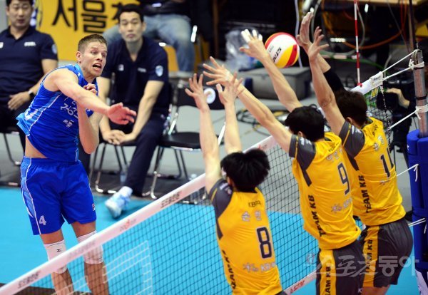 11일 경기도 의정부체육관에서 ‘2017-2018 도드람 V리그’ 의정부 KB손해보험과 대전 삼성화재의 경기가 열렸다. 삼성화재 타이스가 KB손해보험 블로커를 피해 스파이크를 날리고 있다.