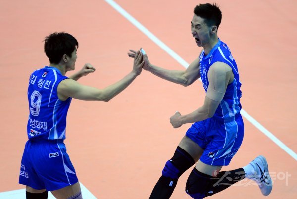 11일 경기도 의정부체육관에서 ‘2017-2018 도드람 V리그’ 의정부 KB손해보험과 대전 삼성화재의 경기가 열렸다. 삼성화재 박철우가 블로킹을 성공한 뒤 포효하고 있다.