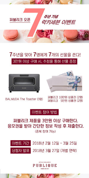 3만원 이상 구매 고객을 대상으로 추첨을 통해 총 7명에게 발뮤다 토스터기(3명), 퍼블리크 베이커리 상품권(10만원권-2명, 5만원권-2명)을 증정한다. 3월27일 개별 연락을 통해 당첨자를 발표한다.