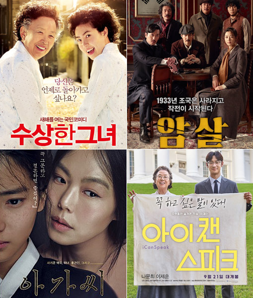 여성 주연 영화 ‘수상한 그녀’ - ‘암살’ - ‘아이 캔 스피크’ - ‘아가씨’(왼쪽 상단부터 시계 방향으로). 사진제공|CJ엔터테인먼트·쇼박스·롯데엔터테인먼트