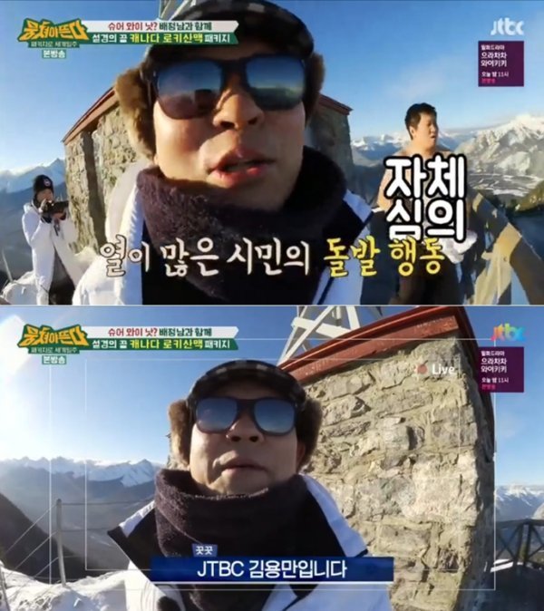 로키산맥에 오른 멤버들. 이들은 뉴스 중계방송을 흉내 내면서 즐거운 시간을 보냈다. 설산을 배경으로 리포터로 변신한 김용만 옆에 정형돈이 등장했다. 그는 갑자기 상의를 벗어던지고 소리를 질러 눈길을 끌었다. 제작진은 재빠르게 모자이크를 하고 ‘자체심의’라는 자막을 띄워 웃음을 유발했다.