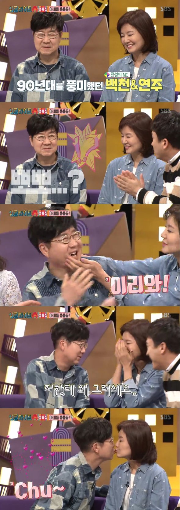 이날 임백천과 김연주는 데님으로 커플룩을 맞춰 훈훈함을 자아냈다. 두 사람은 스킨십 요청에 쑥스러워하면서 고개를 돌려 키스하는 척 했다. 출연진들은 “90년대 스타일”이라고 지적했다. 저돌적인 김연주와 달리 임백천은 고개를 피하며 부끄러워했다. 하지만 이내 결연한 표정으로 다가가 김연주와 달콤한 ‘버드 키스’를 나눴다.