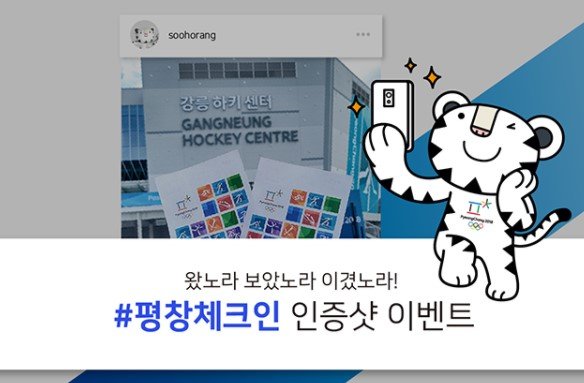 대회 첫 경기가 열린 2월 8일부터 시작된 이벤트는 많은 참여 속에 폐막일인 25일까지 계속되며, 인증샷을 남긴 참가자 중 추첨을 통해 SK-Ⅱ 화장품 세트, 마스코트 수호랑 인형, 영화 관람권 등 푸짐한 경품을 받을 수 있다. 인증샷 이벤트는 #2018평창, #평창체크인 해시태그가 반드시 포함돼야 한다.