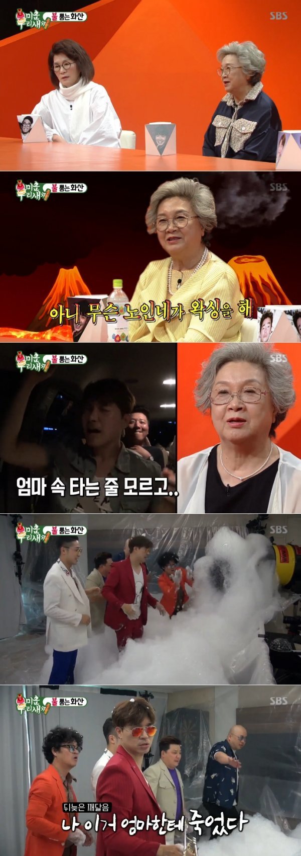김건모 어머니는 “나는 박수홍이 클럽 가는 차 안의 장면에 가장 놀랐다. 그때 청심환 있어야 할 것 같았다. 어머니 넘어가실 것 같더라”고 털어놨다. 박수홍 어머니는 “그때도 진짜 열 받았다”고 고백했다. 그러면서 “우리 아들이 깜짝 놀랄 일을 제일 많이 한 것 같다. 표현을 안 해서 그렇지 화나는 때가 정말 많았다”고 말했다. 이에 신동엽은 “표현을 안 하신 것 같죠?”라고 미소 지었다.
