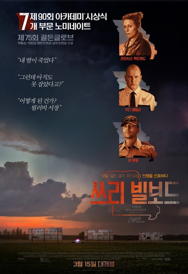 이렇듯, 탄탄한 이야기와 배우들의 열연으로 골든글로브와 영국 아카데미에서도 최다 수상의 쾌거를 이룬 ‘쓰리 빌보드’가 제90회 아카데미 주요 부문 수상에 대한 기대감을 증폭시키고 있다. 3월 15일 개봉.