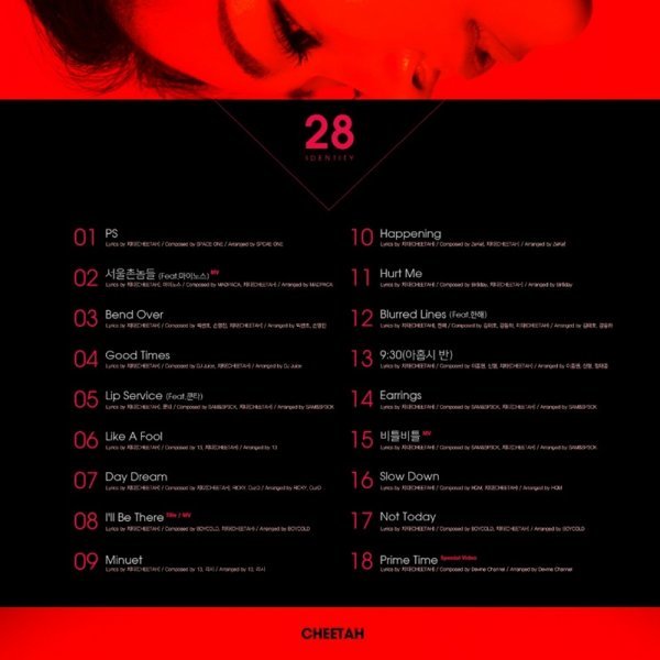 중앙에는 검정색 배경에 흰색 및 다홍색 텍스트로 ‘28 IDENTITY’에 수록된 트랙 목록이 나열돼있다. 이미지 상단에는 치타의 얼굴을 삽입해 마치 트랙리스트를 내려다보는 듯한 느낌을 보는 이들에게 전달해 눈길을 끈다.