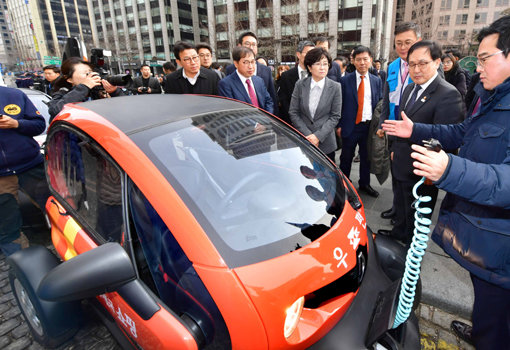 르노삼성자동차는 19일 오후 서울 광화문우체국에서 열린 우정사업본부, 과학기술정보통신부, 환경부 간의 ‘친환경 배달장비 보급 확산’을 위한 MOU 및 시범사업 발대식에 참가해 초소형 전기차 트위지의 시연행사를 진행했다.