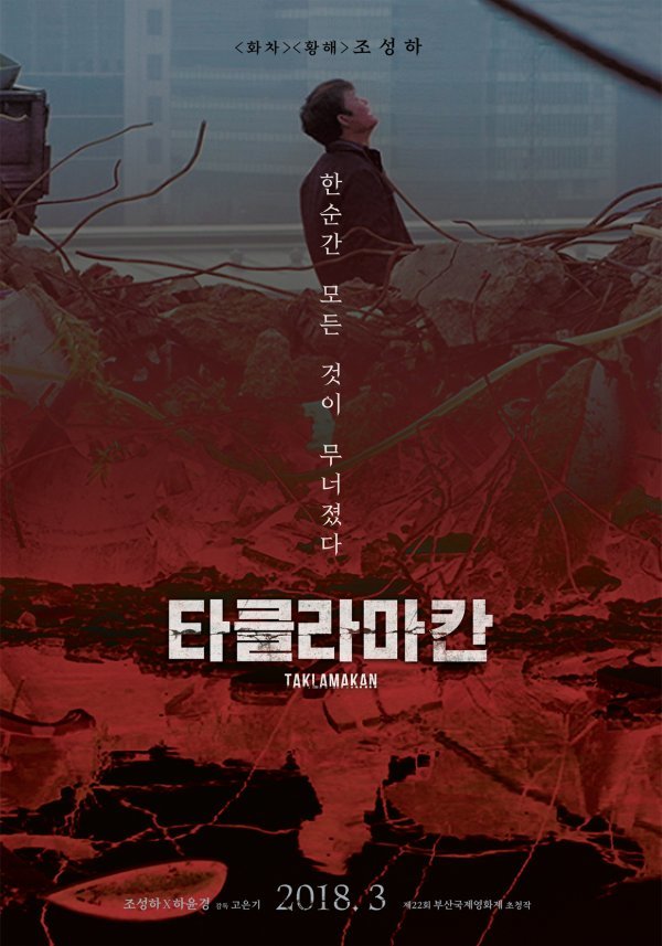 \'타클라마칸\'은 3월 개봉 소식과 함께 황폐하고 섬뜩해서 되려 궁금증을 불러일으키는 티저 포스터를 공개했다. 이번에 공개된 티저 포스터는 일단 그 배경과 색감만으로도 보는 이를 압도한다. 마치 선혈로 물들인 듯 한 붉은 색감이 황폐하기 그지없어 보이는 배경을 뒤덮으며, 곧 그곳에서 심상치 않은 일이 벌어질 것을 암시한다. 여기에 고개를 젖히고 개탄하듯 하늘을 바라보는 주인공 태식의 모습이 더해지며, 알 수 없는 불편함마저 느껴진다. 이에 더해진 곧 갈라져 깨질 것만 같은 타이틀과 ‘한순간 모든 것이 무너졌다’란 카피는 그럼에도 불구하고 영화에 대한 궁금증과 기대감을 키우는 역할을 한다.