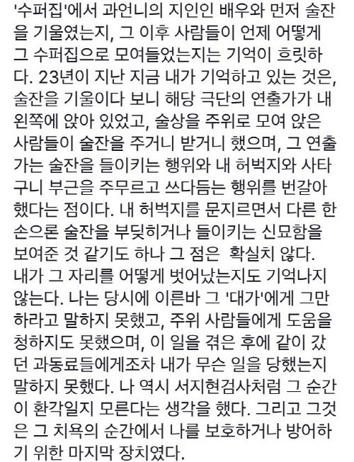이어 “그의 손목을 낚아채며 말 했어요. 전, 선생님 딸 친구예요! 난, 그것으로 끝을 낼 수 있으리라 믿었어요. 내 앞에 앉아있던 사람들에게도 드디어 내가 보이고 들리는 기적이 일어난 듯 했어요, 내 앞에 그 선배가 나와 눈을 맞추고 말했어요, ‘니가 걔 친구냐? 세상에 세월 빠르네’ 그들은 너털 웃음과 함께 술잔을 비웠고 난, 또다시 투명인간이 되었어요”라고 덧붙였다.