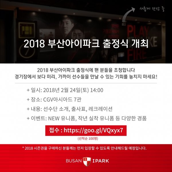 프로축구 K리그2(챌린지) 부산아이파크가 오는 24일(토) 오후 2시 CGV아시아드 부산아이파크관 (7관)에서 팬들과 함께하는 출정식을 개최한다.