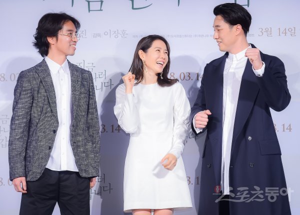 감독 이장훈과 배우 손예진과 소지섭(왼쪽부터)이 22일 서울 광진구 롯데시네마 건대입구에서 열린 영화 ‘지금 만나러 갑니가’ 제작보고회에 참석해 포즈를 취하고 있다.