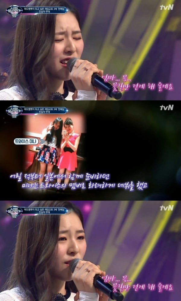 이후 시작된 무대에서는 이 1번 가수인 전예임은 김세정의 ‘꽃길’을 선곡해 애절한 감성을 보여줬다. 특히 이 과정에서 트와이스 미나와 함께 가수를 준비했던 때의 사진도 공개돼 눈길을 끌었다.