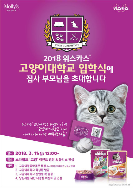 이번 2018 위스카스 고양이대학교 입학식은 이마트의 반려동물 원스탑 편집숍인 몰리스펫샵과 공동으로 개최된다. 입학식 참여 신청은 3월3일까지 전국 이마트 및 스타필드 내 몰리스펫샵 35개점에서 고양이캔, 파우치 등의 고양이사료나 고양이용품 구매 고객이면 누구나 가능하다.