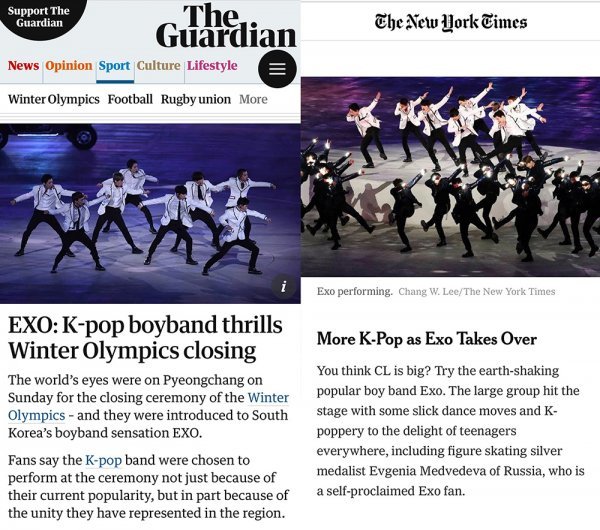 영국 유력 일간지 가디언(The Guardian)은 지난 24일(현지시간) 홈페이지를 통해 ‘케이팝 보이 밴드인 엑소가 동계 올림픽 폐막식을 전율시키다(EXO: K-pop boyband thrills Winter Olympics closing ceremony)’라는 제목의 기사를 게재하고 엑소의 이번 폐막식 공연을 보도해 엑소의 글로벌한 영향력을 다시 한번 실감케 했다.