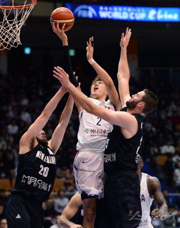 26일 서울 잠실실내체육관에서 열린 ‘2019 FIBA 농구 월드컵’ 한국과 뉴질랜드의 아시아 예선경기에서 한국 최준용이 뉴질랜드 선수를 피해 슛을 쏘고 있다.