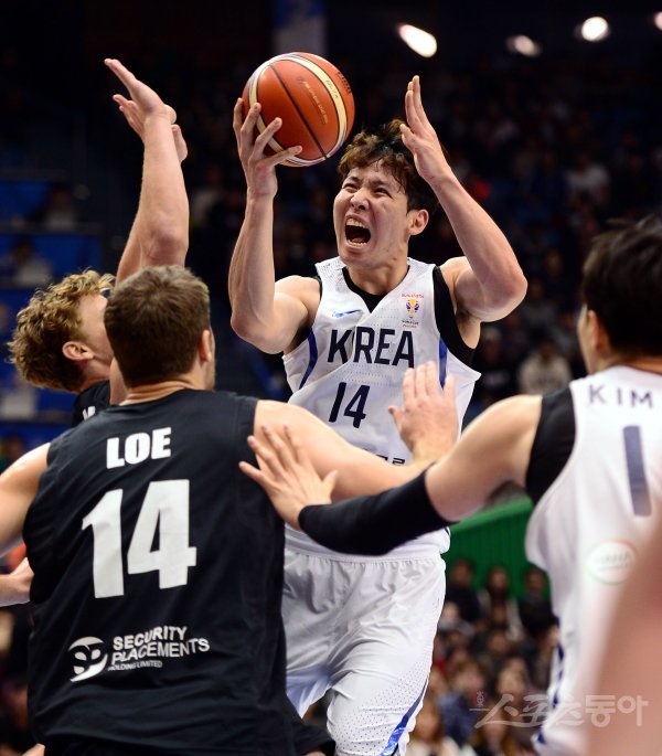 26일 서울 잠실실내체육관에서 열린 ‘2019 FIBA 농구 월드컵’ 한국과 뉴질랜드의 아시아 예선경기에서 한국 최부경이 뉴질랜드 선수를 앞에 두고 슛을 쏘고 있다.