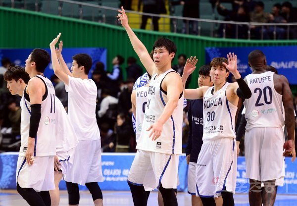 26일 서울 잠실실내체육관에서 열린 ‘2019 FIBA 농구 월드컵’ 한국과 뉴질랜드의 아시아 예선경기에서 한국이 뉴질랜드에 84-93으로 패한 뒤 선수들이 팬들에게 인사하고 있다.