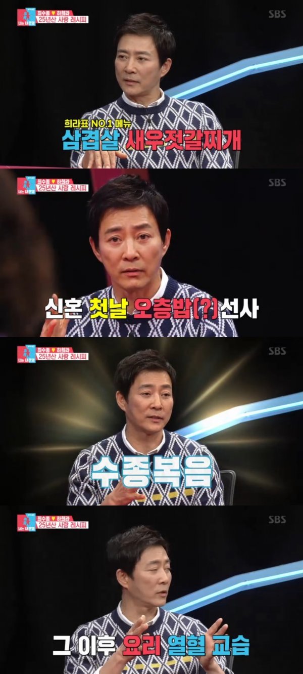 최수종은 “처음부터 하희라가 요리를 잘 하지 못했다. 신혼 첫 날에 5층 밥을 만들었다”라며 “그래서 내가 ‘이런 밥을 할 수 있는 사람은 하희라 씨 밖에 없다’라고 말했다”라고 말했다.