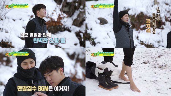 라면과 함께 절경을 즐기기도 잠시, 장난기가 발동한 두 사람은 영하 10도의 추위에도 아랑곳하지 않고, 입수를 건 물수제비 대결을 시작했다. 두 남자의 뜨거운 승부욕에 촬영현장이 후끈 달아올랐다. 실제로 대결에서 진 패자는 강추위 속에서도 맨발로 호수에 입수해 벌칙을 수행했다는 후문.