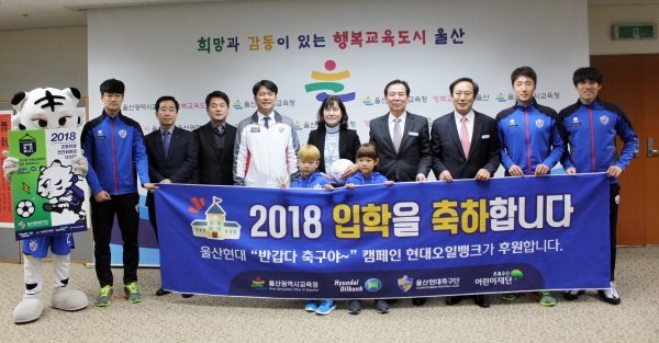 이날 협약식에는 류혜숙 울산광역시교육청 부교육감, 김상현 현대오일뱅크 울산지사 지사장, 배익철 초록우산 어린이재단 울산지역본부 본부장이 참석했으며 울산현대축구단에서는 김광국 대표이사를 비롯해 김창수, 조영철, 이상헌이 선수 대표로 참석했다. 신입생 대표로는 명덕초등학교 입학 예정인 김시윤 어린이가 참석했다.