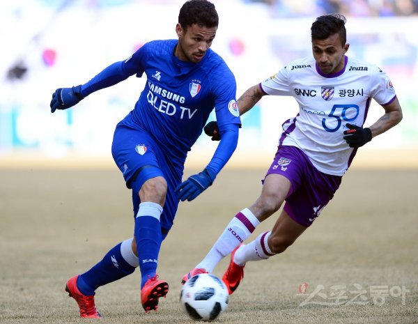 1일 수원 월드컵경기장에서 ‘KEB하나은행 K리그1 2018’ 수원 삼성과 전남 드래곤즈의 경기가 열렸다. 수원 크리스토밤이 전남 완델손과 볼 다툼을 벌이고 있다.