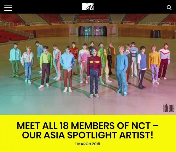 더불어 MTV ASIA는 지난 1일(현지시간) 홈페이지를 통해 NCT의 ‘MTV ASIA SPOTLIGHT’ 선정 소식을 발표하며 “NCT는 데뷔 후 끊임없이 놀라운 성장을 보여왔다. 그들은 ‘일곱 번째 감각’, ‘Cherry Bomb’, ‘Chewing Gum’ 등 발표곡들로 전 방송을 장악했고, 새롭고 흥미진진한 세 명의 멤버가 합류, 올해의 활약을 기대케 하는 컴백 프로젝트 ‘NCT 2018’을 시작했다”고 설명해 NCT와 ‘NCT 2018’에 대한 높은 관심을 실감케 했다.