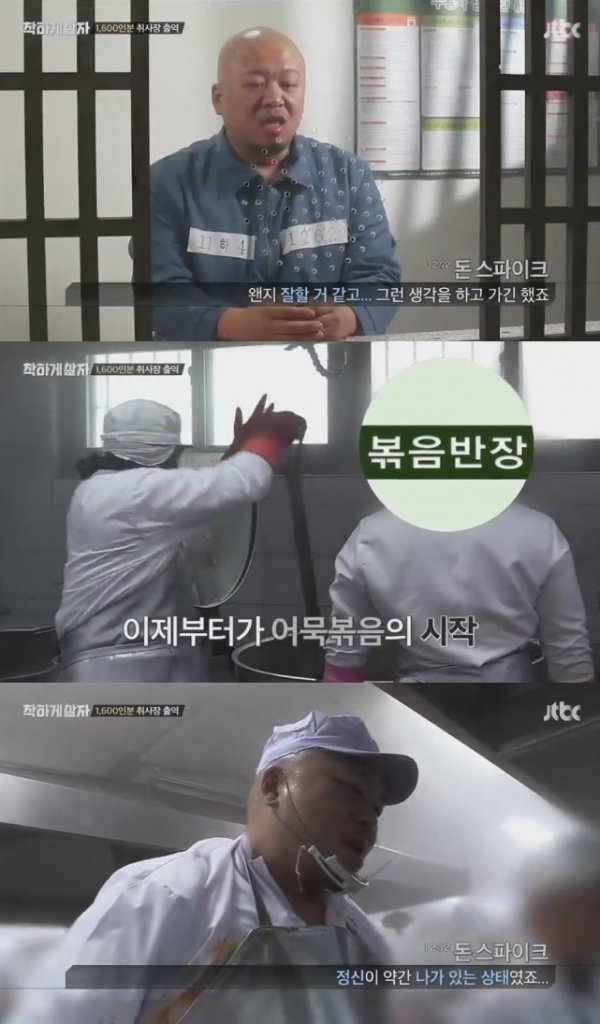 2일 JTBC \'착하게 살자\'에선 4번방 수용자들의 출역 현장이 공개됐다. 김보성, 유병재, 돈스타이크는 취사장으로 향했다. 이들은 1600인분 음식을 만들어야했다.