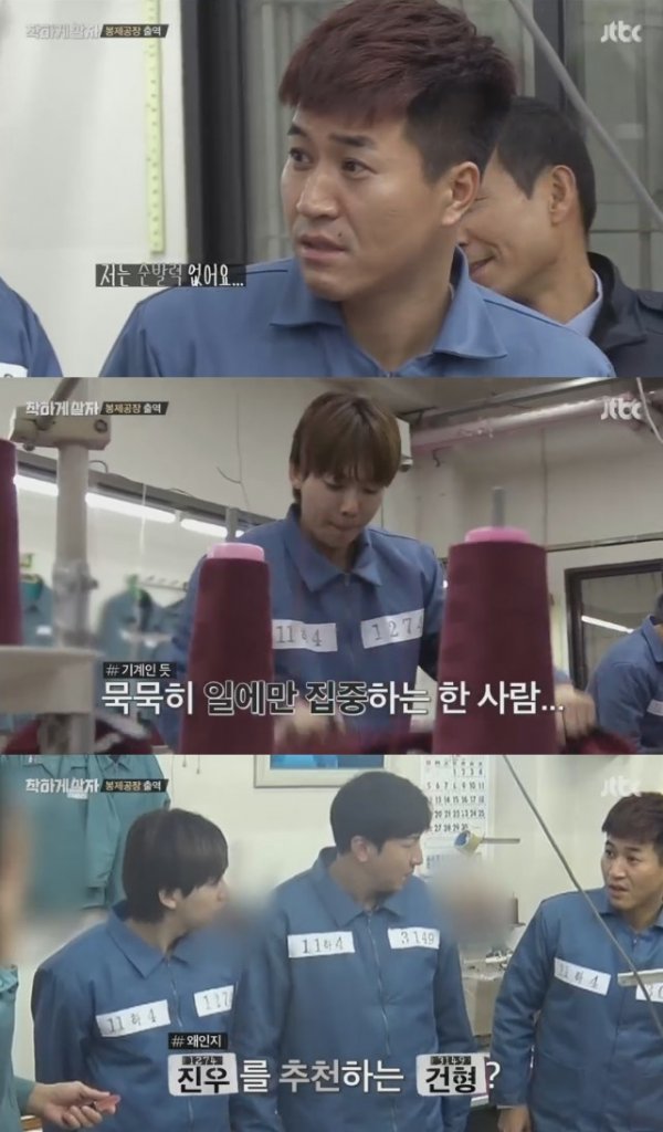 2일 JTBC \'착하게 살자\'에서 박건형, 김진우, 김종민은 봉제공장 출역에 나섰다. 이들은 찜질복을 만들어야했다.