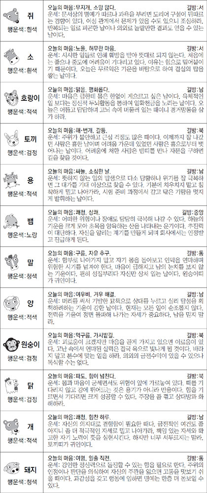 ▲ 오늘의 운세 도표. 스포츠동아