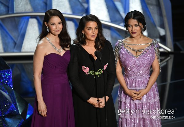 지난해 할리우드에서 ‘미투’ 운동을 시작한 애슐리 저드, 애너벨라 시오라, 셀마 헤이엑(왼쪽부터)이 5일 미국 로스앤젤레스 돌비극장에서 열린 제90회 아카데미 시상식에서 시상자로 나섰다. 사진=게티이미지코리아