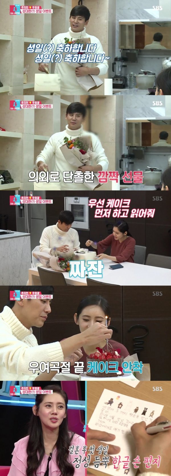 이후 추자현은 딸기가 듬뿍 올라간 케이크를 보며 환호했다. 우효광은 “결혼하고 처음으로 맞는 생일이다”라며 미리 준비한 편지를 읽어 내려갔다. 특히 처음으로 한글로 쓴 손편지를 준비해 감동을 자아냈다.