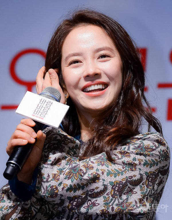 배우 송지효가 6일 서울 강남구 압구정로에 위치한 CGV 압구정에서 열린 영화 ‘바람 바람 바람’ 제작보고회에서 환하게 웃고 있다.