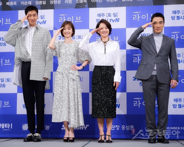 배우 이광수와 정유미, 배종옥, 배성우(왼쪽부터)가 6일 서울 강남구 논현동 임피리얼 팰리스 호텔에서 열린 tvN 새 토일드라마 ‘라이브’ 제작발표회에 참석해 포즈를 취하고 있다.