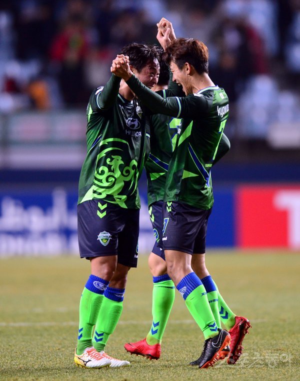 6일 전주월드컵경기장에서 열린 ‘2018 아시아축구연맹(AFC) 챔피언스리그’ 전북 현대와 텐진 취안젠(중국)의 조별예선경기에서 전북 한교원이 역전골을 성공시킨 뒤 최보경과 기쁨을 나누고 있다.