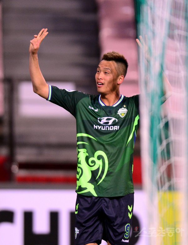 6일 전주월드컵경기장에서 열린 ‘2018 아시아축구연맹(AFC) 챔피언스리그’ 전북 현대와 텐진 취안젠(중국)의 조별예선경기에서 전북 김신욱이 해트트릭을 기록한 뒤 환호하고 있다.