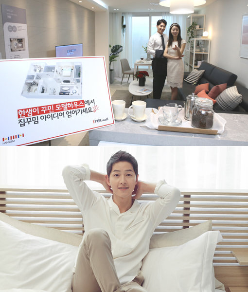 아이파크몰 5층에 오픈한 한샘 디자인파크(위쪽), 현대리바트 모델 송중기. 리빙 분야가 유통 격전지로 떠오르고 있다. 사진제공|한샘·현대백화점그룹