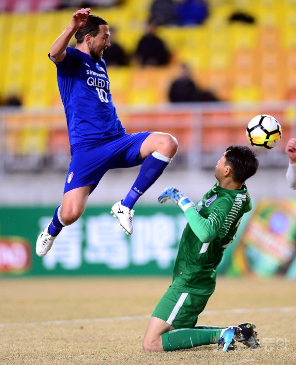 7일 경기도 수원월드컵경기장에서 열린 ‘2018 아시아축구연맹(AFC) 챔피언스리그’ 수원 삼성과 상하이 선화(중국)의 조별예선경기에서 수원 데얀이 상하이 골키퍼를 앞에 두고 슛을 날리고 있다.