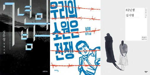 정유정 작가의 소설 ‘7년의 밤’-장강명 작가의 소설 ‘우리의 소원은 전쟁’-조남주 작가의 소설 ‘82년생 김지영’(왼쪽부터). 사진제공|은행나무·예담·민음사