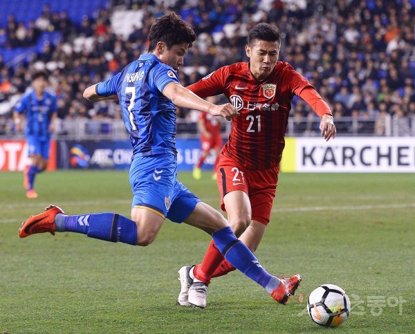 13일 울산월드컵경기장에서 2018 AFC 챔피언스리그 울산현대와 상하이 상강의 경기가 열렸다. 전반 울산현대 김인성이 상하이 상강 유하이의 마크를 앞에 두고 슈팅을 때리고 있다.
