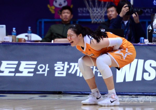 13일 인천 도원체육관에서 열린 ‘신한은행 2017-2018 여자프로농구’ 인천 신한은행과 청주 KB의 플레이오프 2차전 경기에서 4쿼터 KB 박지수가 5반칙으로 물러나자 아쉬워하고 있다.