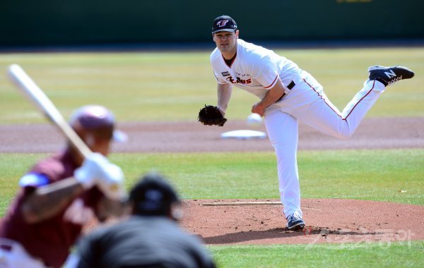 한화 선발투수 휠러가 힘차게 볼을 던지고 있다.