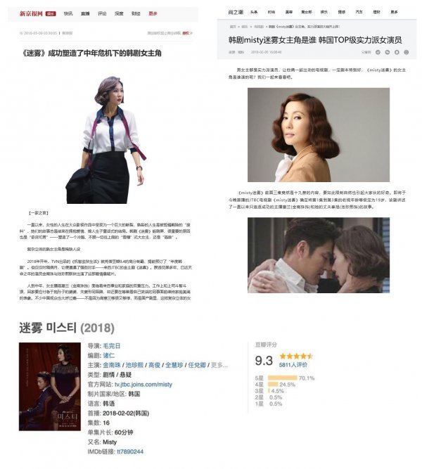 뿐만 아니라 중국 각종 뉴스에서는 배우 김남주와 드라마 ‘미스티’에 대해 심층 보도하며, 높은 관심을 보였다. 특히 중국의 한 매체인 韩娱台(Hanyutai)에서는 ‘미스티’에 대해 ‘2018년 베스트 드라마임에 틀림없다’라고 평가했다.