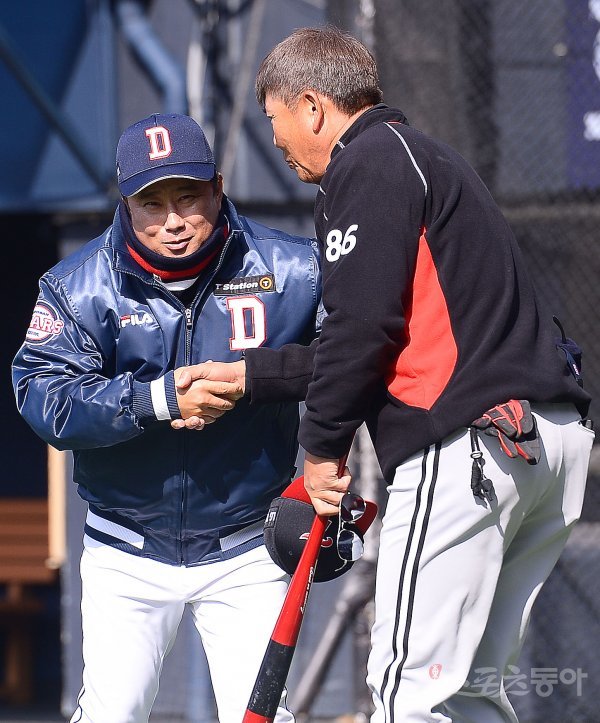 17일 잠실야구장에서 2018 신한은행 마이카 KBO리그 시범경기 두산베어스와 LG트윈스의 경기가 열린다. 경기를 앞두고 두산 김태형 감독이 LG 신경식 코치와 인사를 나누고 있다.